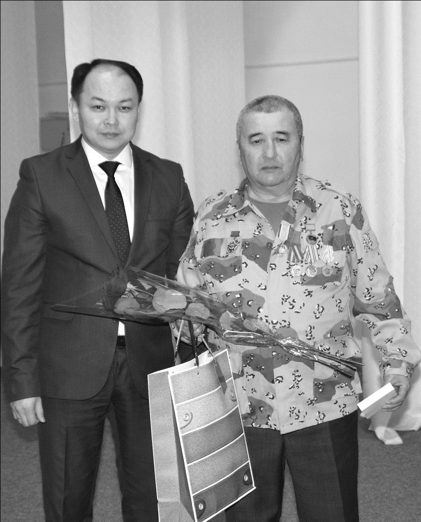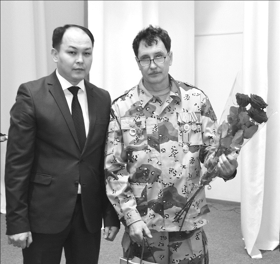 Призыв на службу в армию а Афганистане. Зачастую полк, где проходил службу Радик Фаритович сопровождал и проводил защиту и прикрытие пехоты от бомбардировок. Аким района Малгаждаров Бауржан Багдатович вручает ценные подарки ветеранам.